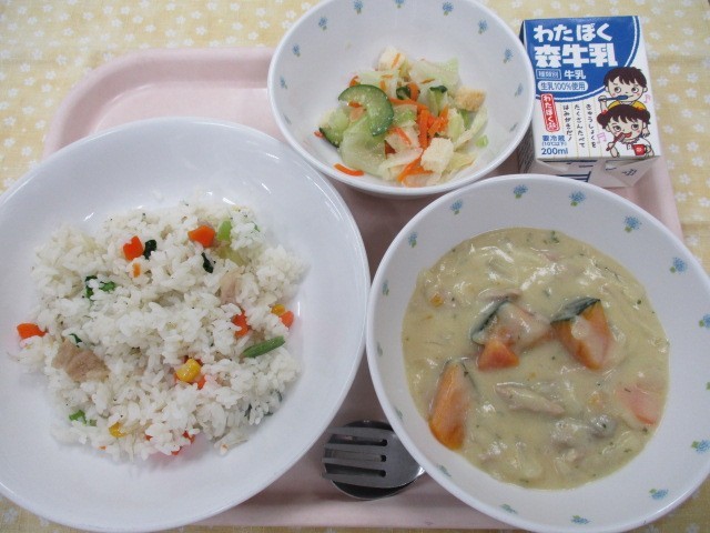 今日のピラフの小松菜は東京都八王子市の菱山従道さんの、サラダのきゅうりは同じく東京都八王子市の鈴木達也さんの畑でとれました。