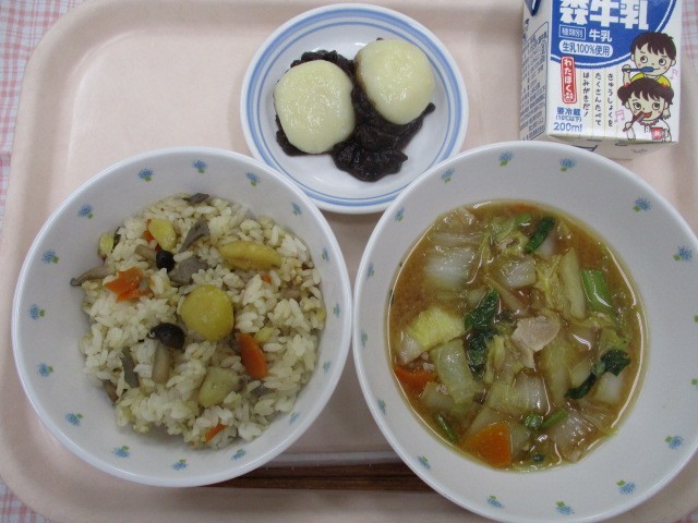 11月2日は十三夜でした。十三夜は旧暦の8月15日の十五夜に続いて、旧暦の9月13日にお月見をする風習があります。十三夜の月は、栗名月、豆名月ともいわれます。そこで、今日の給食では、栗を使った吹き寄せごはんと、小豆を使った白玉ぜんざいを用意しました。