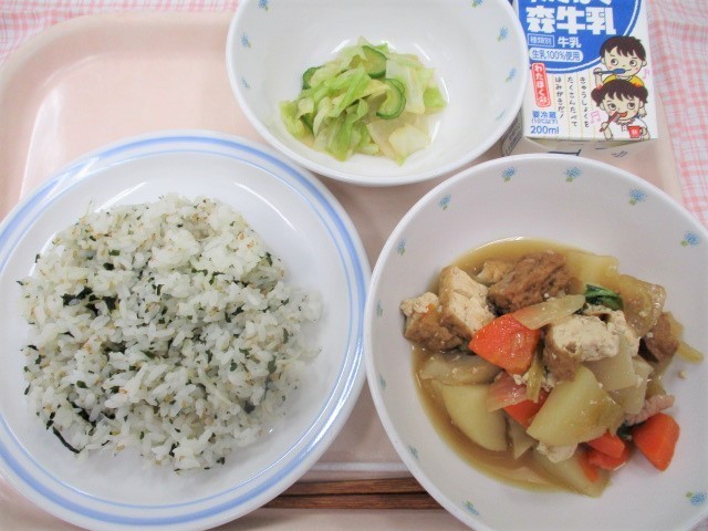 歯や骨の材料となるカルシウム。成長期の皆さんには大切な栄養素です。今日はそんなカルシウムがたっぷりの献立にしました。カルシウムを多く含む食品は、しらす、生揚げ、牛乳などです。歯を丈夫にするには噛むこと、丈夫な骨を作るには運動も大切です。しっかりと噛んで食べるようにしましょう。