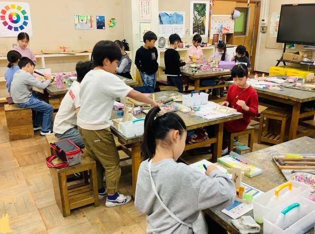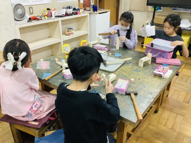 3年生の図工「くぎうちトントン」では、図工の授業で初めて釘を打つ学習をしました。金づちの安全な使い方を学んでから、実際に板に釘を打ちました。最初は恐る恐るだった子供たちも、少しずつ道具の使い方に慣れて、夢中になって何本も釘を打ち込む様子が見られました。出来上がった作品を、ニコニコしながら満足そうに見つめる姿が印象的でした。