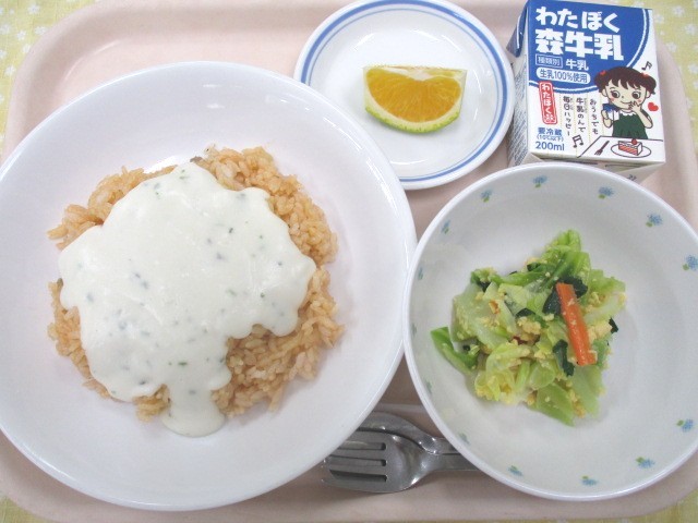 今日のメインは、チキンライスホワイトソースかけ。チキンライスの上のホワイトソースは雪景色をイメージしました。寒い季節ですが、植物は春に花を咲かせる準備をしています。サラダには春の花のミモザをイメージした炒り卵を入れ、春を待ちのぞむ気持ちを表しました。