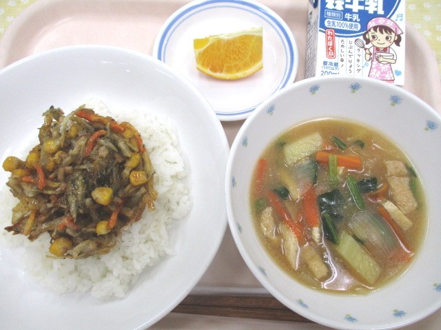 本から飛び出したメニューのお節料理にちなんだ献立、最終日です。「田作りは いわしの子 田んぼの肥しになる魚。お米がたくさん実りますように」という願いが込められています。今日はみそ汁のだしをとったあとの田作りをかき揚げに混ぜました。カルシウムたっぷりです。