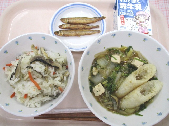 今日は給食日本紀行:秋田編です。きりたんぽ鍋は、秋田県の大館・鹿角地方が発祥で、炭焼きや伐採のために山籠りをした人々が、残り飯をつぶして棒に刺して焼いて食べていたものを鳥鍋に入れたことが始まりといわれています。給食では、きりたんぽを別に焼いて出しています。汁を入れた器に、きりたんぽを入れ食べてください。