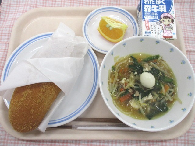 学校給食週間2日目は、昭和27年に誕生した揚げパンです。以前に揚げパンを出したときにも紹介しましたが、当時の大田区の調理員さんが、欠席した児童に給食のパンを届けるため、硬くなってしまうパンを、おいしく食べてもらうために油で揚げ、砂糖をまぶす揚げパンを考案したということです。今日はきなこと砂糖をまぶしてあります。春雨スープは給食定番のメニューです。たっぷりの野菜と春雨、それにうずら卵が入っています。