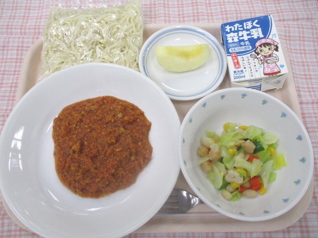 学校給食週間4日目は、ソフト麺を使ったミートソーススパゲティです。