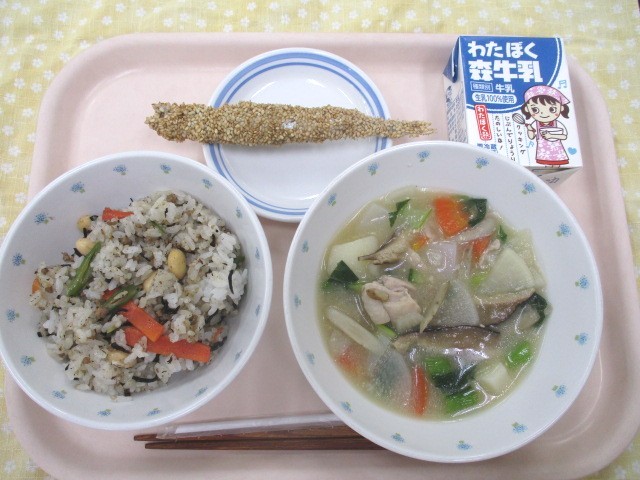 さつま汁は鹿児島の郷土料理で、鶏肉が入った具だくさんのみそ汁です。みそのもとは大豆ですが、塩と麹菌と呼ばれるカビが生えた食材を加えて作られます。この麹が、米か麦か大豆かで大きく味が変わります。今日は麦麹で作られた麦みそで味付けされています。