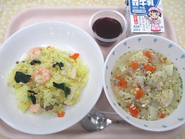 今日は給食世界紀行:スペイン編です。パエリアはスペインのバレンシア地方発祥の米を使った料理です。両側に取っ手のある底が平らで深さの浅い丸型のパエリア専用の器具で具材を炒め、米・香りと色を付けるサフランを加えて炊き上げます。給食では、サフランの代わりにターメリックと使って米を炊き、具はベーコン、えび、ヤリイカなどを炒め、混ぜ合わせています。