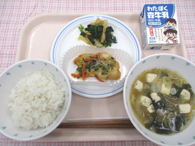 6年生が考えた献立、8日目です。おすすめポイントを紹介します。「たらとわかめは2月が旬です。わかめスープはあったまるし、栄養のバランスが良いし、おいしい!!たらは あんかけにすることで緑と赤の栄養がとれ、さっぱりおいしいので、これを選びました。」6年生の思いを受けっとって、味わっていただきましょう。