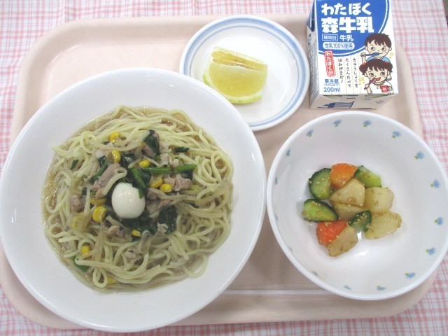 今日のラーメンは、下目黒小学校特製ラーメンです。スープは、昆布、煮干し、鶏がらからとり、味付けはしょうゆ、具には豚肉、もやし、コーン、長ねぎ、ほうれん草、うずらの卵を使っています。ラーメンは江戸時代の終わりに開港した横浜、神戸、長崎、函館に多くの外国人が移り住んだことをきっかけに日本に伝わった、中国の麺料理がルーツといわれています。長い年月を経て、日本独自のラーメンとなりました。