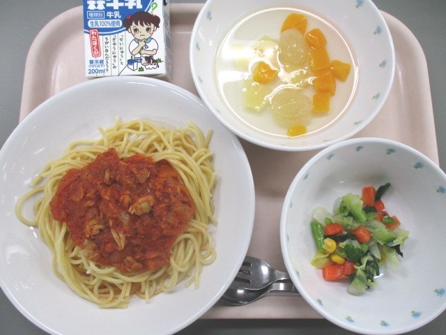 今日の給食は本から飛び出したメニューです。今月は、おはなし料理教室「こまったさん」シリーズの一冊目「こまったさんのスパゲティ」(寺村輝夫作・岡本颯子絵 あかね書房)です。こまったさんが、こまったこまったと言いながら、不思議 な空間でおいしい料理をつくります。