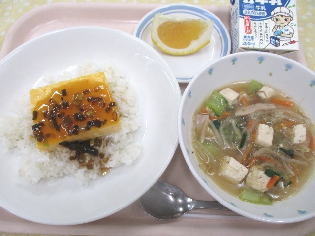 天津丼は、丸く焼いたかに入りの卵焼き、いわゆるかに玉をごはんの上にのせ、甘酢あんをかけていただく料理です。給食では大量に作るので、大きな鉄板で焼き上げたかに玉を切り分けました。かに玉には、すでに甘酢あんがかかっているので、そのままごはんにのせて配膳します。