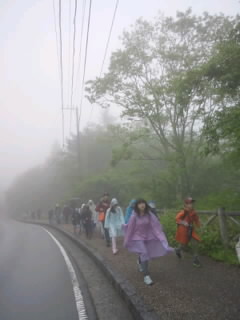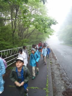 濃い霧の中、まきば公園まで歩きました。途中小雨が降りましたが無事に到着しました。お弁当をバスの中でとり、楽しみにしていたソフトクリームを食べて、お家の人へお土産を買いました。