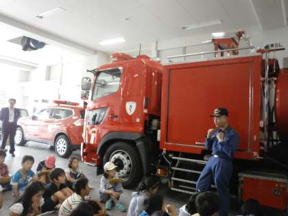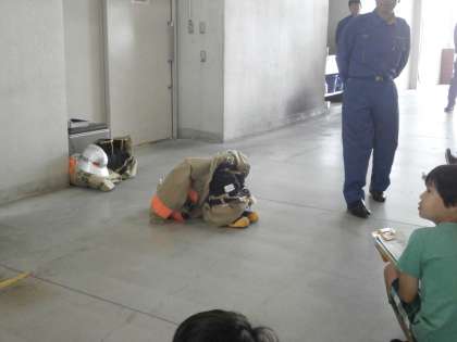 はしご車での訓練を見た後は、別の消防車を見たり、出場の時の早着替えを見ました。