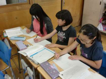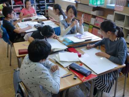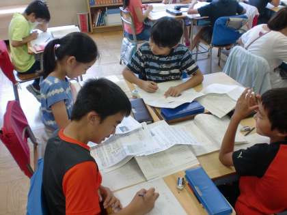 国語科の学習では、目黒区を訪れた方に区の良さを紹介するパンフレット作りの学習が始まりました。良さを伝えるのに最もふさわしいと思う施設・建物や自然・公園を各々が一つ選び、調べ学習を進めています。子供たちはブレインストーミングをしながら、良さをいくつも考え出していました。