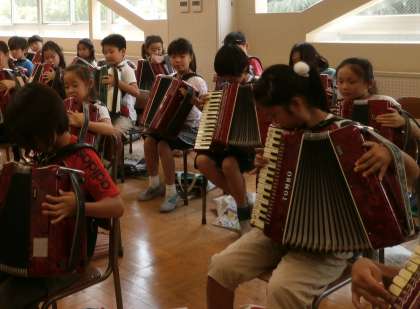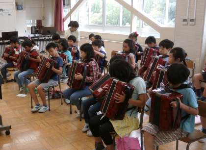 実際持ってみると「重ーい!」「肩が痛い!」の声。でも蛇腹を動かしながら鍵盤を弾く面白さを感じて夢中で練習していました。