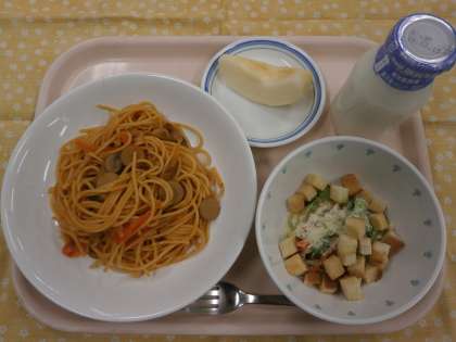 カリカリパンのサラダは、給食室で作ったクルトンが入ったサラダです。