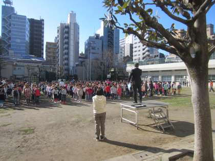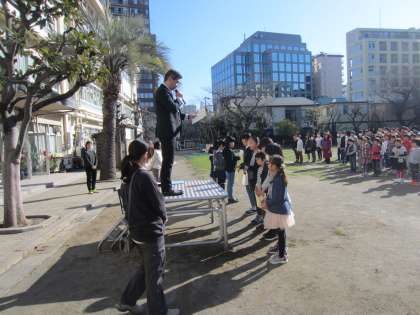 暖かな日射しの中、全校朝会を行いました