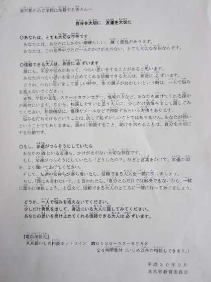今日の朝会では、東京都教育委員会からの子供たちへのメッセージ「自分を大切に 友達を大切に」を伝えました