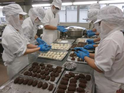 給食室は朝から大忙し。約800個のぼたもちを、素早く丁寧に作って下さいました。