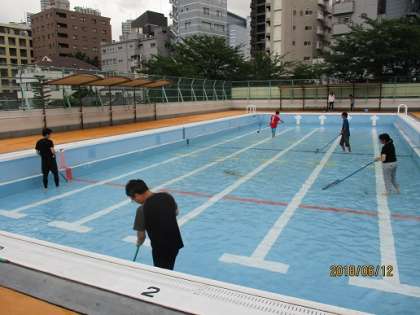 来週から始まる水泳指導に向けて、職員でプール清掃を行いました。