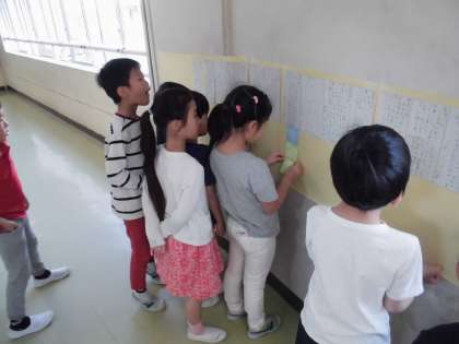 国語科で、連休中にしたことや見たことを題材に、ニュースを書きました。読む人が知らなかったことを伝えることのできる題材を選び、自分の体験とその感想を2つの文で書きました。特に、感想を詳しく書くことに気を付けながら、文章を考えました。書き終った作品は時系列で掲示し、互いに読み合いました。また、読んだ感想を一言ずつ付箋に書いて、友達のニュースの下に貼りました。何枚も意欲的に書いている子がたくさん見られました。