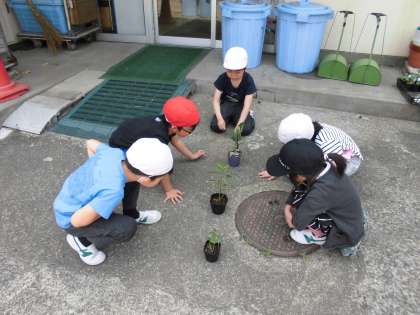 生活科の学習で、ナス、ピーマン、オクラの苗を植えました。それぞれの特徴をじっくりと観察した後、どの苗が一番大きく成長するかを予想しました。はじめは今一番背の低いオクラの急成長を期待する声が大きかった子供たちですが、「実が一番大きいのがナスだから、ナスが一番大きくなるのでは」という一人の子のつぶやきをきっかけに、一気にナスを推す子が多くなりました。子供の柔軟な発想の素晴らしさを感じました。また、植える時にもどの野菜を南側に植えるか、日光と植物の成長の関係も考えながら、植える場所を子供たちで相談して決めました。これから夏休み前までに大きく成長することを楽しみにしている様子が見られました。