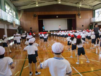 木曜日から、運動会で演技するダンスの練習が始まりました。2年生と一緒に、ひとつひとつの動きを先生のお手本を見て覚えていきます。テーマは「スマイル」です。