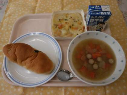 名前だけではどんなものが出るのか分からなかったようですが、食缶を開けた時に「グラタンだー!」と喜んでいる顔していました。どのクラスもよく食べていました。
