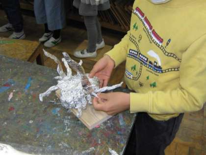 子供たちは、アルミフォイルでどんな形が作れるかを考えながら、好きな長さにアルミフォイルを切っては丸めたり、ぎゅっとにぎったりしながら、形を作っていました。