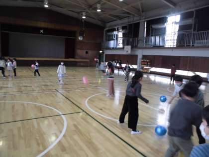 体育館遊びの時は、遊び専用のボールを使ってよいことになっています。外とは違った体育館遊びは、子どもたちにとっては特別な休み時間のようです。