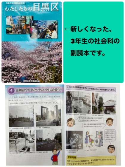 今、3年生の社会科の授業では、「目黒区のうつりかわりとくらしの変化」の学習をしています。今年、3年生が使う副読本が新しくなりました。サイズが大きくなり、写真も増えて、とても見易くなりました。この単元ではまず、この副読本に載っている昔と今の目黒区の写真を比べて同じところや違うところを調べました。そして、みんなで気付いたことを出し合いました。すると、自然環境や交通の様子、便利さが変わってきていることが分かりました。これから更に、目黒区のうつりかわりについて学習を進めていきたいと思います♪