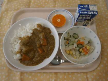 今日のカレーは、玉ねぎの甘さが出るよう1時間くらい炒めてあめ色玉ねぎを作り、具に使いました。食べやすかったようで、どのクラスもとてもよく食べていました。