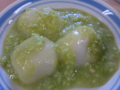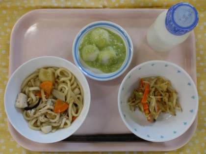 今日の献立は、おくずかけ、キャベツのごま和え、ずんだ白玉、牛乳でした。