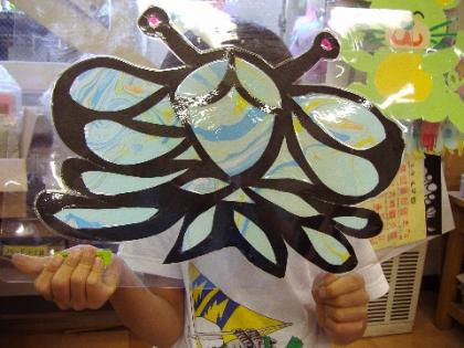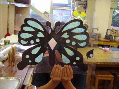 できました。ガラスのところにかざりましょうね。光が通ってとてもきれいですね。