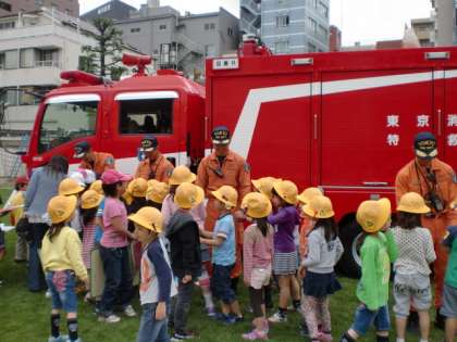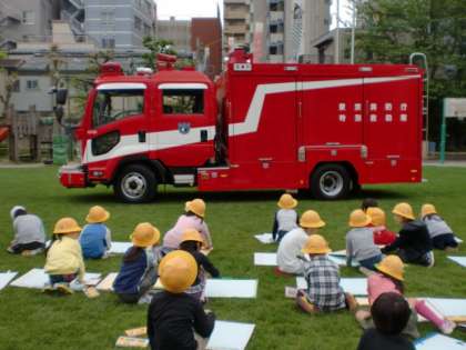 ですが、子供達は、消防士さんが急いで出動準備をする姿を間近で見ることができました。あまりに支度が早いので、「すごーい!」と感心していました。