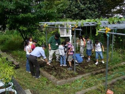 3年の総合的学習の時間の一つに「ビオトープ」があります。今日はビオトープの掃除をしたり畑を耕したりしていました。自分の背丈より大きな植物の根っこを拾い汗を流していました。ビオトープ(Biotop)とはもともとドイツ語で「bio=生き物 + top=住むところ」が語源です。