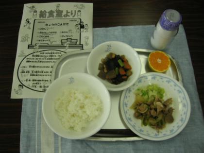 今日の献立はご飯・豚のしょうが焼き・茹でキャベツ・五目豆・みかん・牛乳です。五目豆は好き嫌いがかなりはっきりしていて、「おいしい!」と言う子と「おいしくない」と言う子と様々でした。大豆は低脂質・高蛋白質の代表選手!ですので好きになってくれるとうれしいのですが。1年生はお箸で上手にお豆がつかめるかなあと思っていたらみんなとっても上手にお箸を使い食べていました。