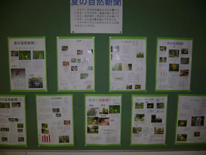廊下に「夏の自然新聞」が掲示されています。ビオトープで観察し記録したことをグループごとにまとめたものです。今は、「秋の生き物の様子や変化」をまとめています。春、夏、秋と調べ、生き物や自然がどう変化するか学び合います。