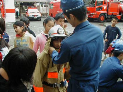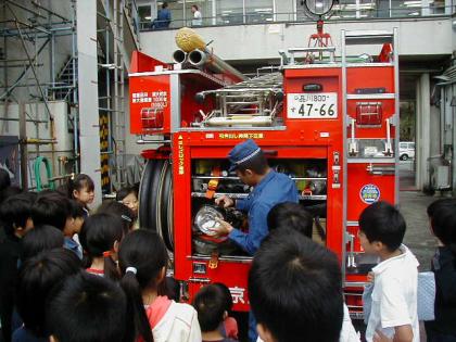 目黒消防署へ見学に行きました。全員が消防服を着ることができました。火の中へ飛び込んだりできるように、特別にできています。一人では重くて着ることができません。消防署の方は火事の連絡があれば30秒以内で消防服を着ると、1分程度で出動するそうです。はしご車は、訓練のため見学できませんでしたが、ポンプ車の装備を見学しました。火事を消すための道具がたくさんありました。