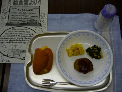 今日の献立は、ダイスチーズパン・れんこんハンバーグ・インディアンポテト・ほうれん草とコーンのソテー・牛乳です。お腹の掃除をしてくれる食物繊維、みかんよりも多いビタミンC、とても栄養価の高いれんこん。煮物だとあまり人気がないので、ハンバーグで慣れてもらうことにしました。お肉の倍もれんこんが入っていますが、ハンバーグそのもの。みんな食べてくれるかな?楽しみです。