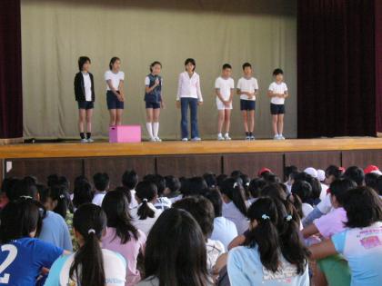 今日の児童集会は、後期の代表委員・委員長の紹介でした。企画・放送・図書・飼育栽培・健康運動・集会の委員長があいさつをしました。次に、3年生以上の代表委員が決意や抱負を語りました。月曜日のあいさつ隊よろしく。