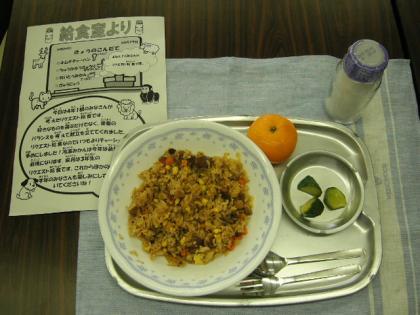今日は4年1組さんのリクエスト給食でした。献立はキムチチャーハン・中華風きゅうり・冷凍みかん・牛乳です。キムチチャーハンはとても人気があって学年を問わず必ずリクエスト給食に挙がってくる献立です。4年生は多目的室で給食を食べました。一緒に給食を食べたのですが「またキムチチャーハンを出して!」とさっそくリクエストされました。4年生はさすがに自分たちの考えた献立だけあって残食はゼロ!牛乳もきれいに飲み干してくれました。1年生は初体験のキムチチャーハンが「おいしかったよー!」と報告してくれました。