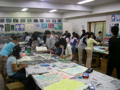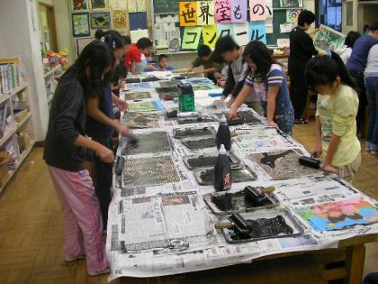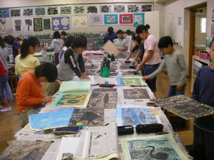 5年生が自然の中で、これは!と思うものを選んで彫った木版画です。バレンを使って一人四枚摺ったのですが、みんな手を黒くしながら楽しく摺り上げることができました。