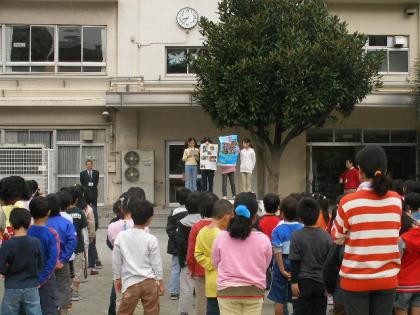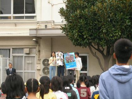 今朝の話は、校長先生がいつも学校をまわって全校の子どもたちのよいとこみつけをして、それを全校朝会やHPなどで知らせているということでした。子どもたちにも友達や自然のよいとこみつけをたくさんしてほしいという話でした。その後、4名の代表委員からユニセフのわかりやすい説明がありました。