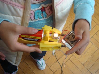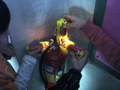 電気を通すもののテスターを制作し、教室や廊下に出て探してみました。すると、クリップ付き磁石や、消火器が電気を通し、テスターの豆電球がピカッと光りました。「ついたついた!」という歓声が廊下のあちこちでこだましていました。