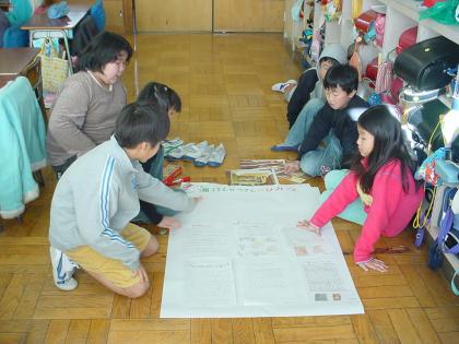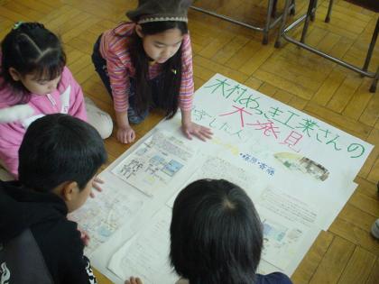 先日伺った工場見学のまとめの学習です。調べてきた内容をグループの中で分担し、模造紙にまとめを仕上げました。「こっちに写真をはった方がいいよ」など、どうやったら伝わりやすいか、ということを考えながらまとめていました。
