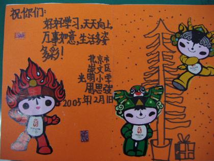 目黒区は中国北京市崇文区と交流があります。このお正月も子どもたちの年賀状の交換がありました。なんといってもすぐお隣の国同士です。ずっと仲良くしていきたいですね、どちらの子どもたちもそう願っているのが作品からよくわかります。子どもたちはすばらしい!!!
