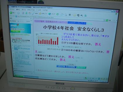 1学期、2学期に学習したことをコンピュータで確認しました。問題の答えを選択肢から選んで答えます。難しかったり、分からなかったりしたところは、解説を読みながら学習しました。冬休みがあって学習してから時間がたっていましたが、地図の見方や土地の利用についてすぐに問題を解くことができました。