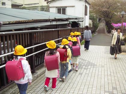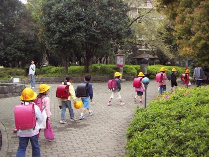 1年生の下校風景をもう一つ。区民センター学童クラブに「帰る」子どもたちは、決まりよく一列に並んで学童クラブまでみんなで行きます。