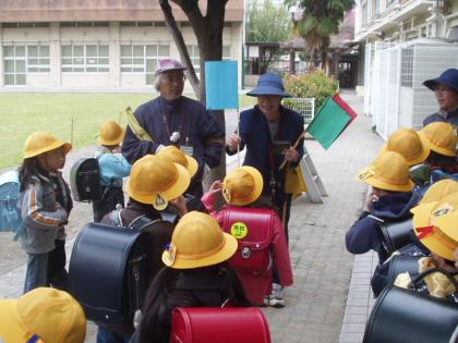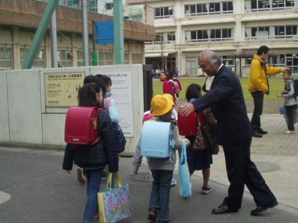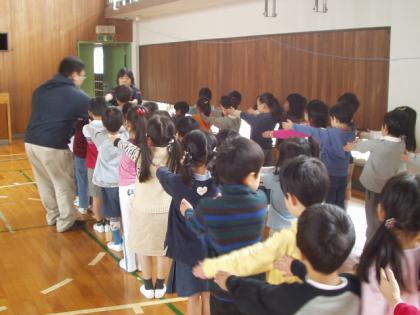 いよいよ1年生の学校生活が始まりました。どの子も入学式での校長先生との約束をしっかり憶えていて、「あいさつジャンケン」で、元気良く挨拶をしていました。今日は、2時間目に対面式(全ての上級生と初めて顔を合わせる式)の練習をしました。「前へならえ」の号令で、しっかりと整列し、大きな声で対面式の練習することができました。他にも挨拶のしかた、物のしまい方、げた箱やトイレの使い方など生活のルールについて学びました。下校時には学童擁護主事さんに、下校のしかたを教えてもらい、みんなで元気に下校しました。今日一日でたくさんのことを学びました。